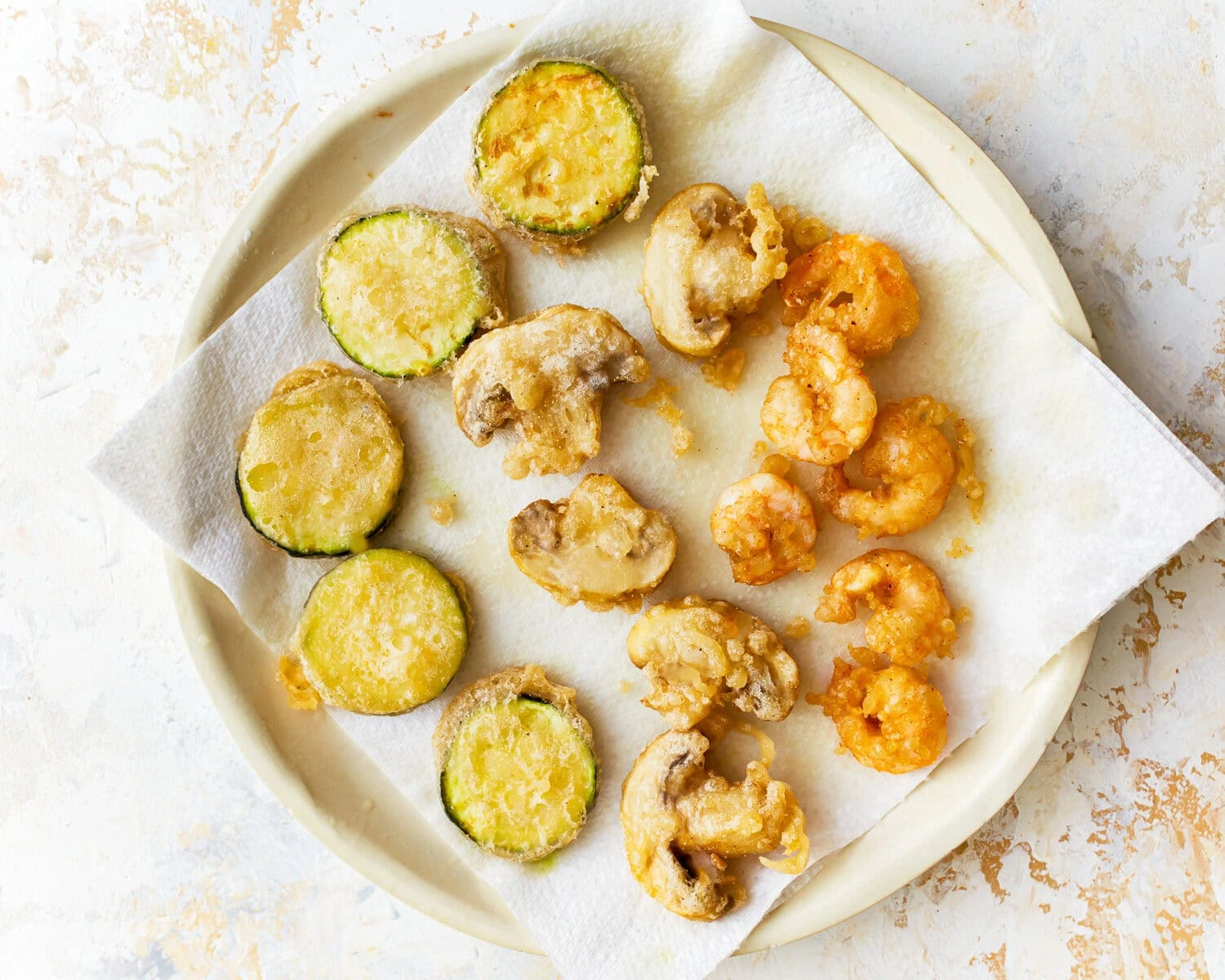 - Hotovou tempuru vyjměte děrovanou lžící nebo kleštěmi a nechte okapat na papírové utěrce.