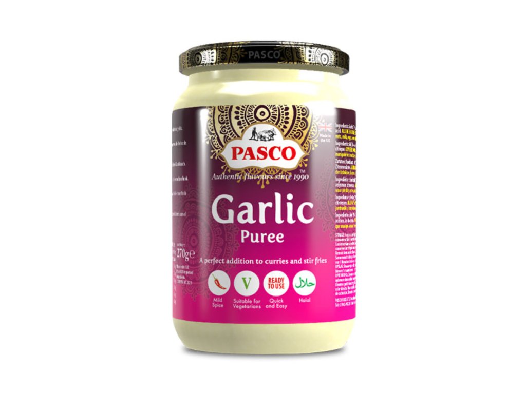 Návod k použitíČesnekové pyré Pasco používejte do dušených pokrmů v indickém stylu (např. dušená čočka), kofty nebo saag panit (sýrové kuličky). |