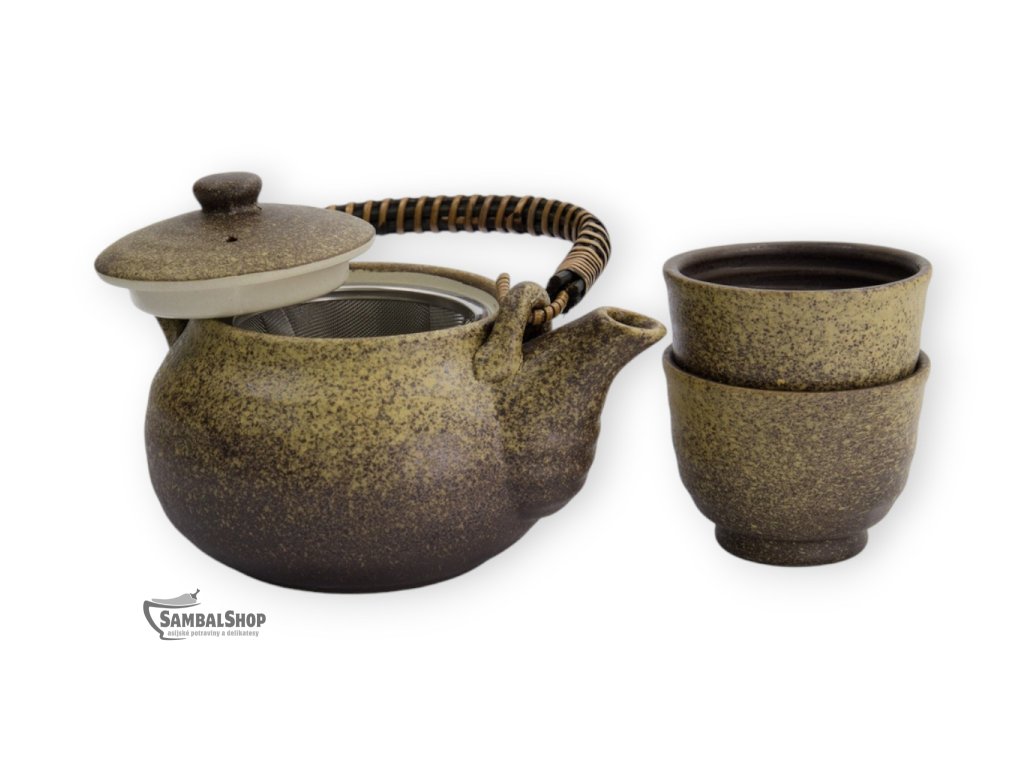 Celá sada je vyrobena z kvalitního porcelánu (složení: porcelán), který je ceněn pro svou odolnost, hladký povrch a schopnost zachovat přirozenou chuť čaje. Na základě přiložené fotografie je patrné, že součástí sady je čajová konvička s víčkem a kovovým sítkem a šálky, které spolu tvoří vizuálně jednotný a funkční celek. Celek působí rustikálně, ale zároveň elegantně.