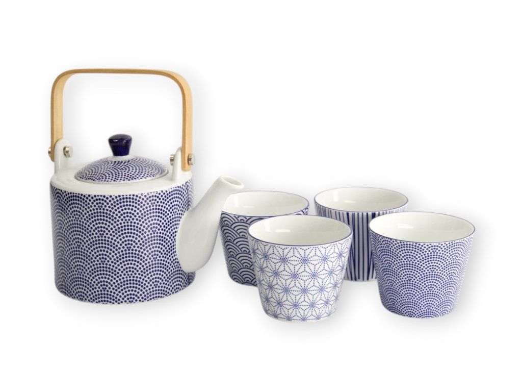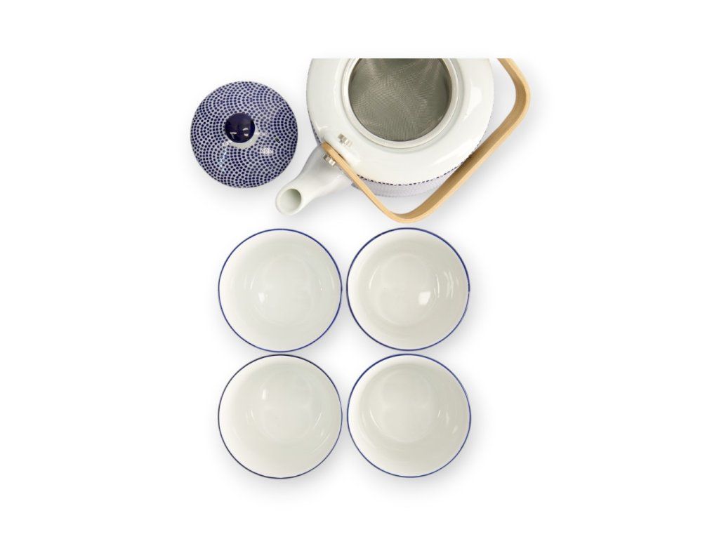 Dominantním prvkem je čajová konvička s dřevěným držátkem, které nejen usnadňuje manipulaci, ale zároveň dodává konvičce výrazný vizuální charakter. Součástí sady jsou také čtyři čajové šálky, každý s jemně odlišným vzorem v modrobílém provedení, díky čemuž lze vytvořit originální a osobitý čajový servis. Sada je balena v krabičce a je vhodná i jako dárek.