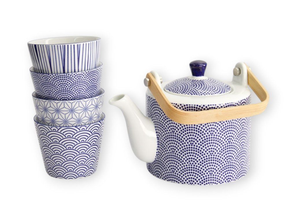 Návod k použitíIdeální pro přípravu a servírování sypaného čaje v japonském stylu – konvička s nerezovým sítkem a dřevěným držátkem zajistí pohodlné louhování i elegantní nalévání. Čtyři modrobílé šálky s rozdílnými vzory umožní vytvořit harmonický čajový rituál pro každodenní i slavnostní chvíle. |