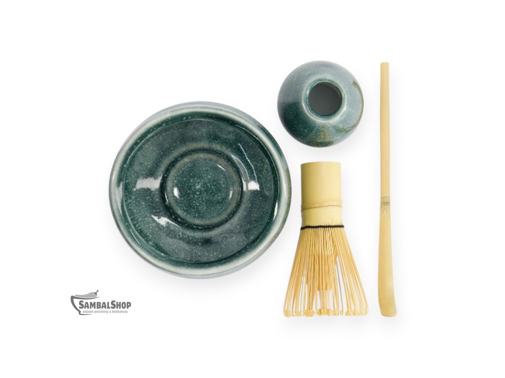 - Obsah sady: keramická miska (chawan), bambusová metlička (chasen), bambusová lžička (chashaku), keramický stojánek na metličku, zelený čaj Matcha – jemně mletý prášek