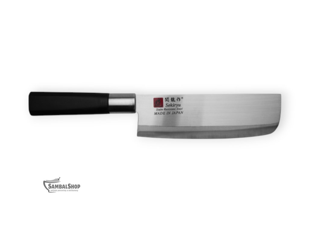 Japonský nůž Seki Ryu Nakiri je tradiční kuchyňský nůž specializovaný na krájení zeleniny, navržený s důrazem na maximální efektivitu, přesnost a pohodlí při práci. Díky rovné, široké a velmi ostré čepeli umožňuje čisté řezy bez drcení surovin, což přispívá k zachování jejich struktury, chuti i vzhledu.