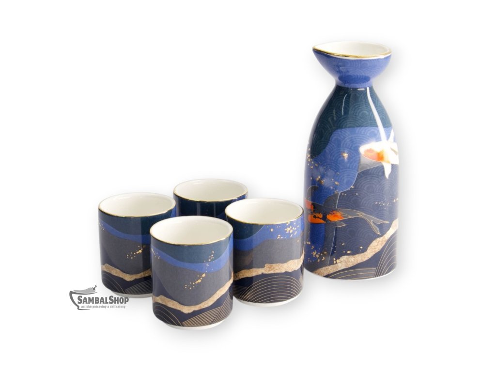 Japonský set na saké Kawaii Koi je elegantní servírovací souprava určená pro tradiční podávání saké. Set se skládá z jedné karafy a čtyř malých šálků, které společně vytvářejí harmonický celek vhodný pro slavnostní i neformální stolování. Barevné provedení v tmavě modrých a modrošedých tónech doplněné o zlaté akcenty působí klidně, vyváženě a zároveň luxusně.