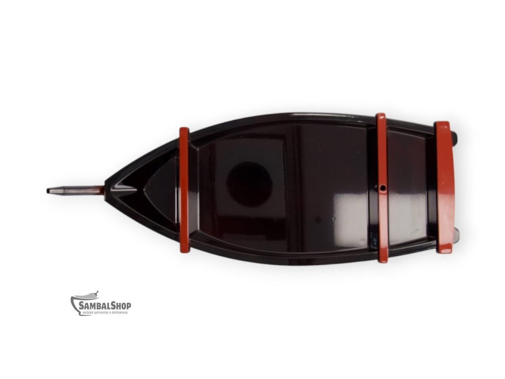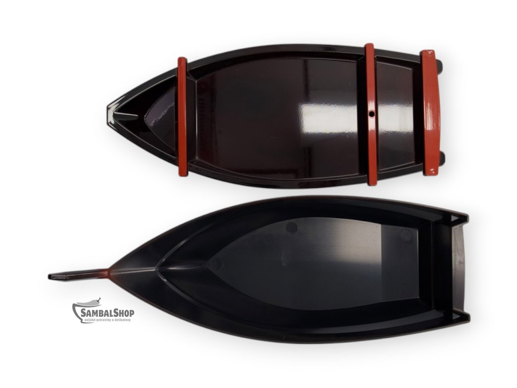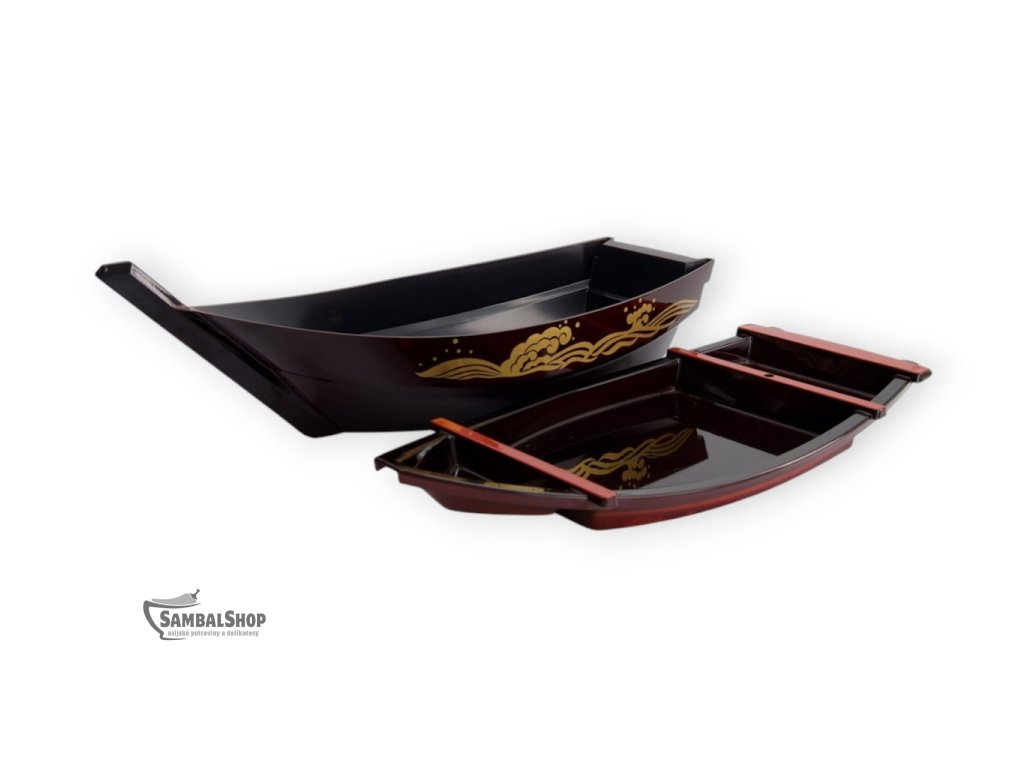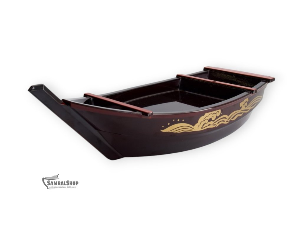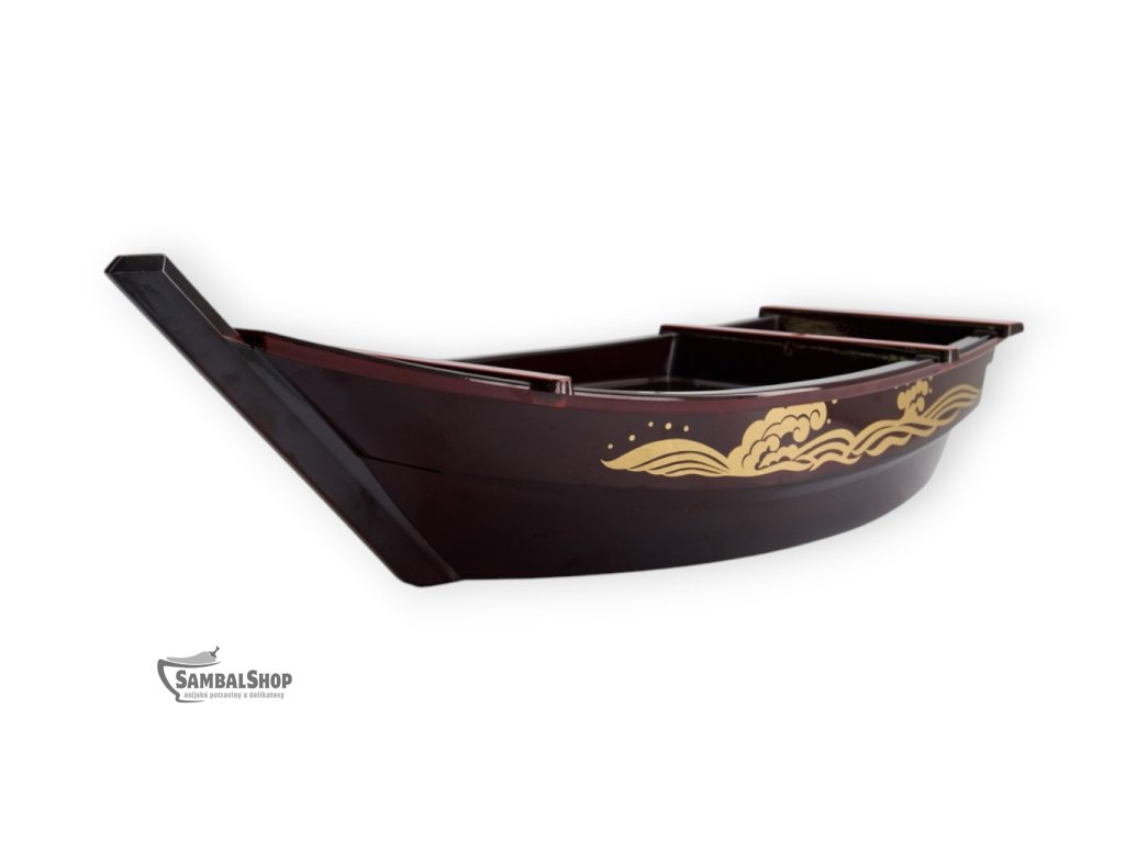 Loď na servírování Sushi Black je tradiční japonská sushi loď (Sushi Boat), která slouží k reprezentativnímu podávání sushi, sashimi a dalších studených pokrmů japonské kuchyně. Tento servírovací kus je vyroben z lakovaného dřeva a zaujme elegantním černým provedením doplněným zlatými dekorativními motivy. Díky svému výraznému tvaru a preciznímu zpracování se stává nejen praktickým nádobím, ale i výrazným vizuálním prvkem prostřeného stolu.
