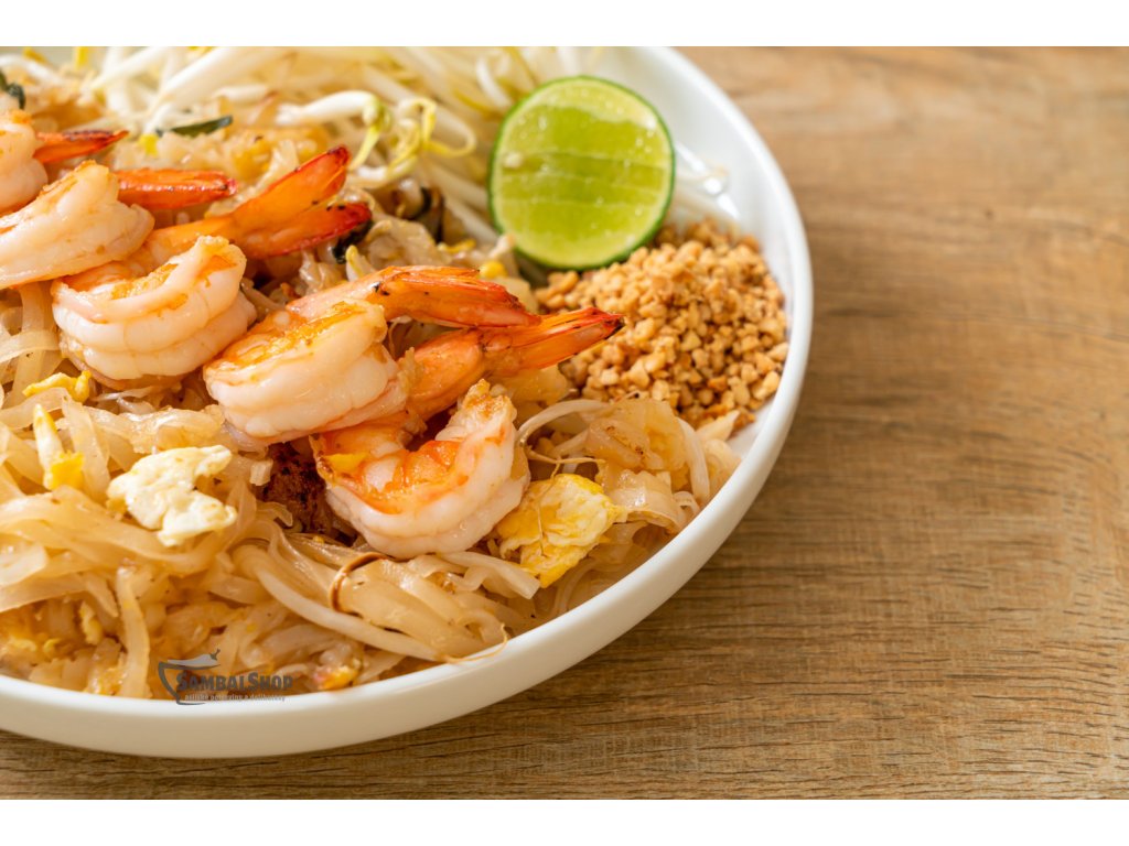 Návod k použitíDo rozpálené pánve dejte 3 lžíce oleje, 100g loupaných krevet a 10 kostek tofu a společně orestujte po dobu 1 minuty. Na okraji pánve osmahněte jedno rozšlehané vejce, přidejte 6 lžic Pad Thai pasty a 200g vařených rýžových nudlí. Směs dobře promíchejte a smažte po dobu 3 minut. Nakonec přidejte 100g fazolových výhonků a nakrájenou pažitku a ještě 1 minutu restujte. Ozdobte měsíčkem limetky a hrstkou pražených nasekaných arašídů. |