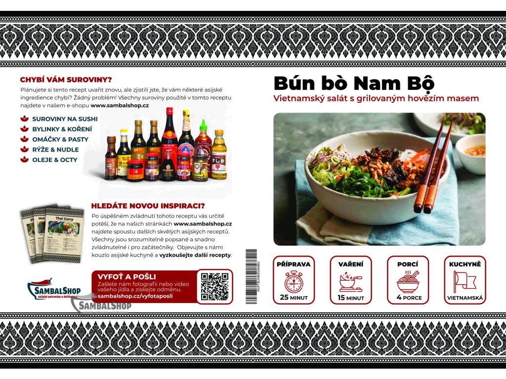 Přinášíme vám profesionálně zpracovaný tištěný recept na přípravu tradičního vietnamského pokrmu Bun Bo Nam Bo. Tento oblíbený pokrm kombinuje čerstvé rýžové nudle s aromatickým hovězím masem a křupavou zeleninou, vytváří tak nezapomenutelný gastronomický zážitek.