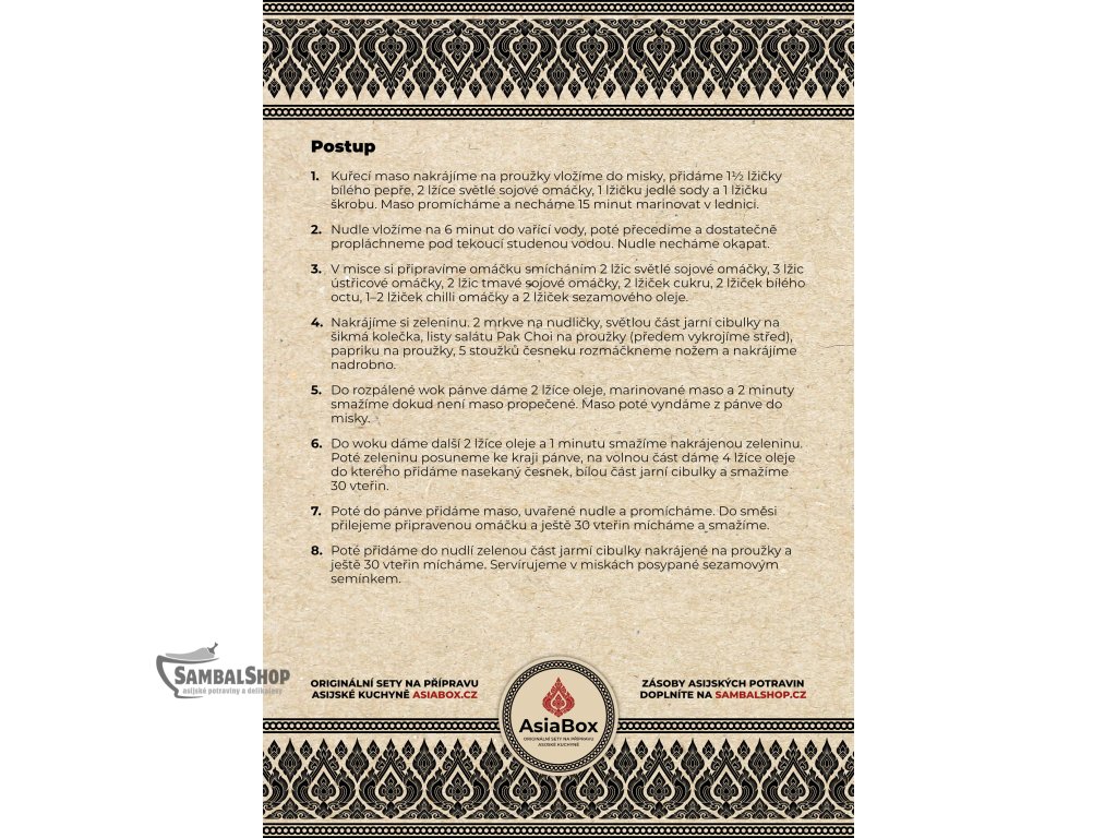 Tento recept je klíčovou součástí naší pečlivě vybrané kolekce tištěných receptů na nejznámější pokrmy z celé Asie. Postupně si můžete sestavit vlastní knihu receptů podle svých chutí a preferencí, sbírat jednotlivé tištěné recepty do své osobní kolekce a budovat si tak unikátní asijskou kuchařku přesně podle svých potřeb.