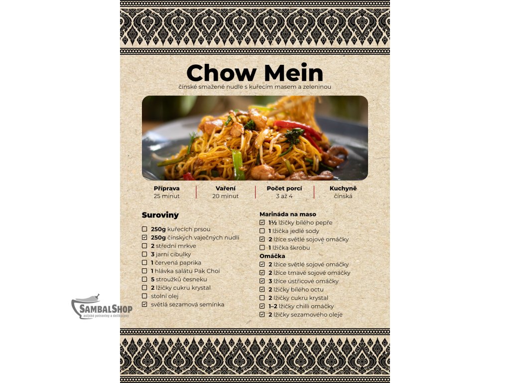 Představujeme vám profesionálně zpracovaný tištěný recept na přípravu tradičního čínského pokrmu Chow Mein. Tyto smažené nudle s křupavou zeleninou a masem patří mezi nejoblíbenější speciality čínské kuchyně a vynikají svojí dokonalou kombinací textur a chutí, které vytváří harmonický a sytý pokrm ideální pro každou příležitost.