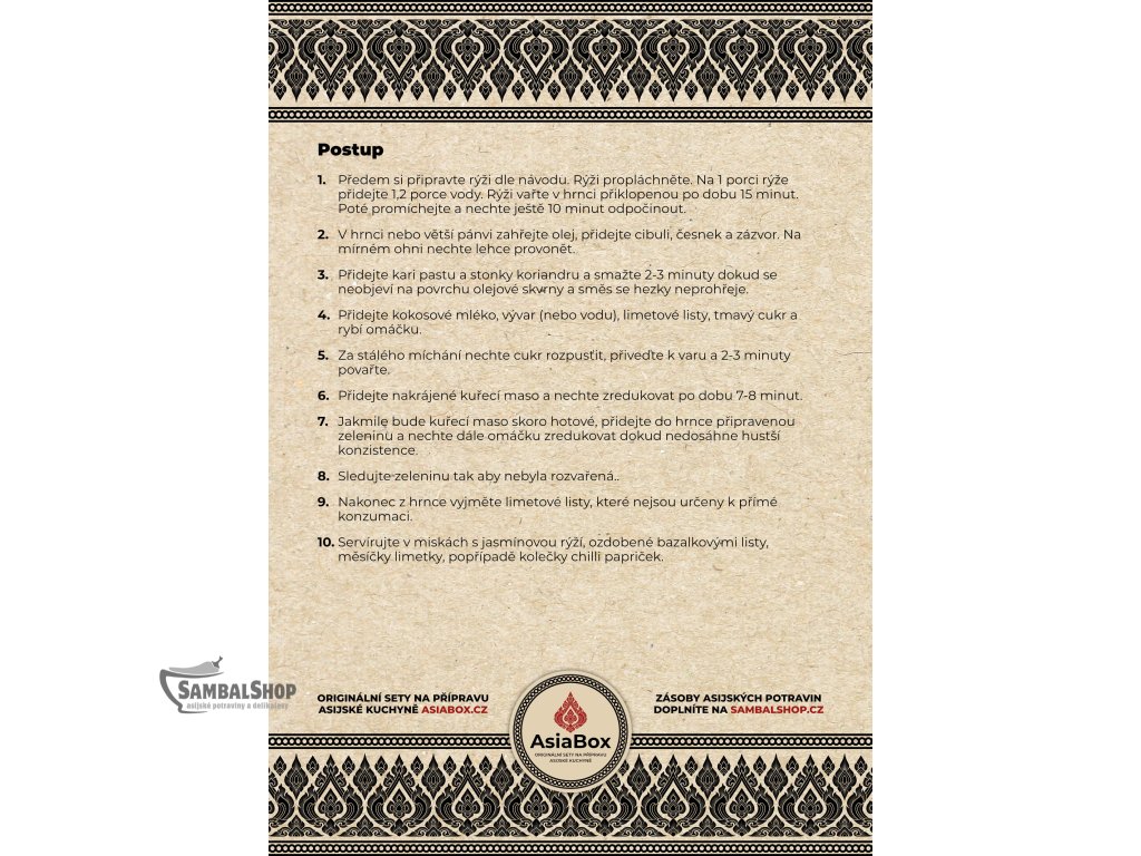 Přinášíme vám profesionálně zpracovaný tištěný recept na přípravu tradičního curry, které patří mezi nejoblíbenější pokrmy asijské kuchyně. Tato aromatická specialita kombinuje výběrová koření s čerstvými ingrediencemi a vytváří tak nezapomenutelnou chuťovou symfonii, která vaše smysly přenese přímo do srdce Asie.