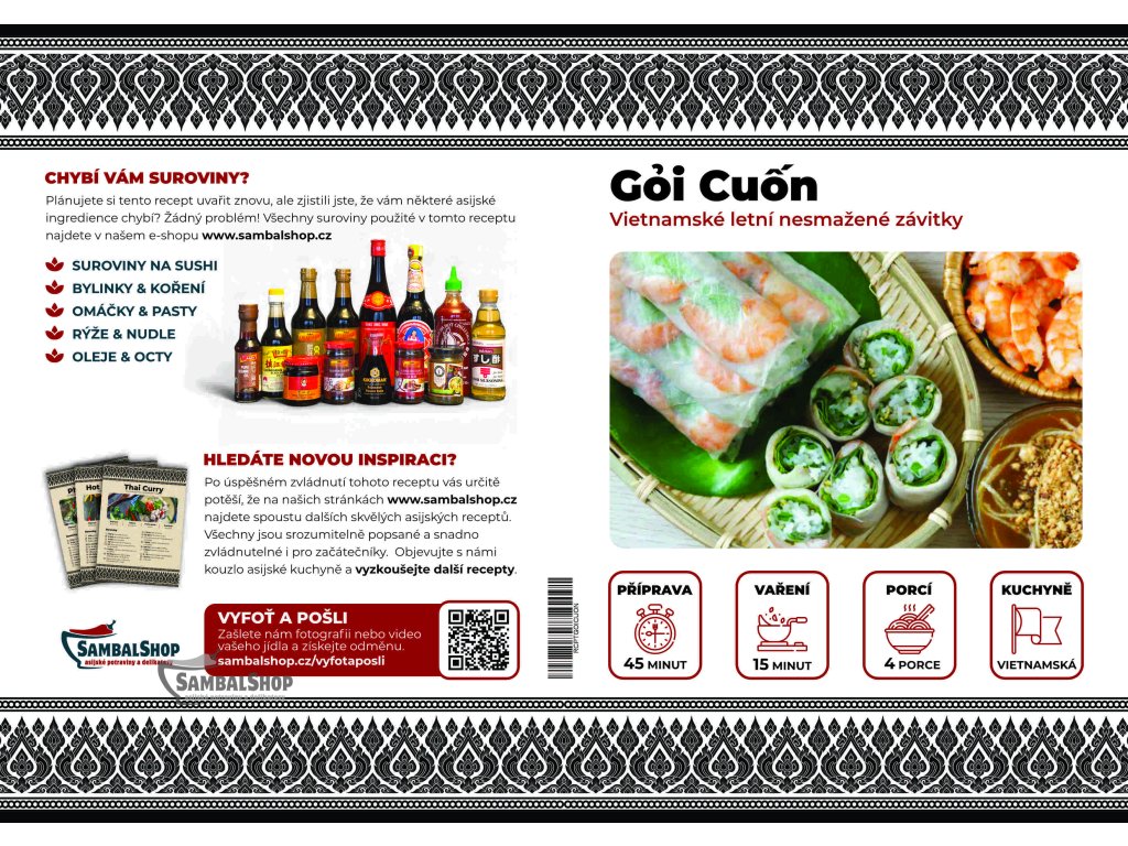Představujeme vám profesionálně zpracovaný tištěný recept na přípravu tradičních vietnamských letních závitek Goi Cuon. Tyto čerstvé a zdravé závitky zabalené v průhledném rýžovém papíru kombinují křupavou zeleninu, aromatické bylinky a šťavnaté maso či krevety, vytvářejí tak lehký a osvěžující pokrm ideální pro každou příležitost.