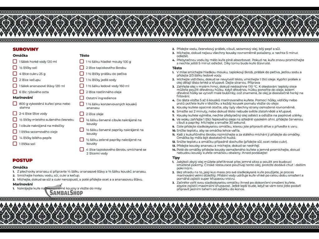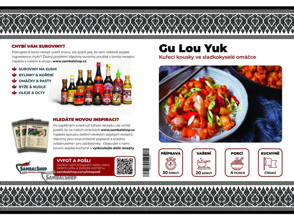Přinášíme vám profesionálně zpracovaný tištěný recept na přípravu oblíbeného čínského pokrmu Gu Lou Yuk, známého také jako sladkokyselé vepřové maso. Tato klasická kantonská specialita kombinuje křupavě osmažené kousky vepřového masa s barevnou zeleninou v lahodné sladkokyselé omáčce, která vytváří nezapomenutelnou chuťovou harmonii.