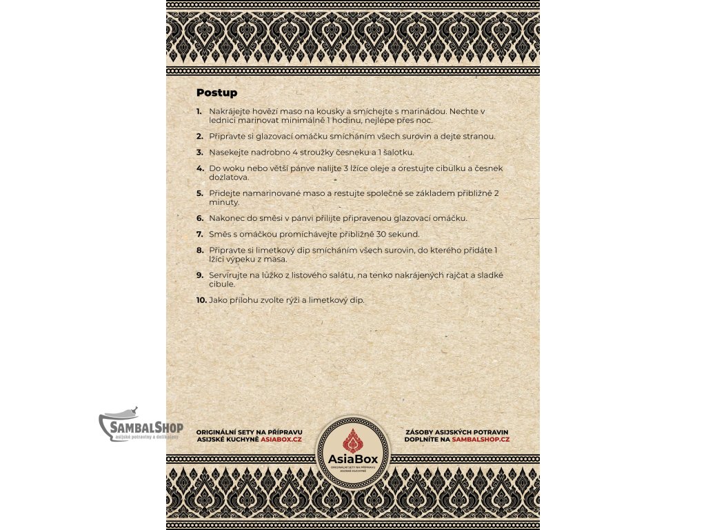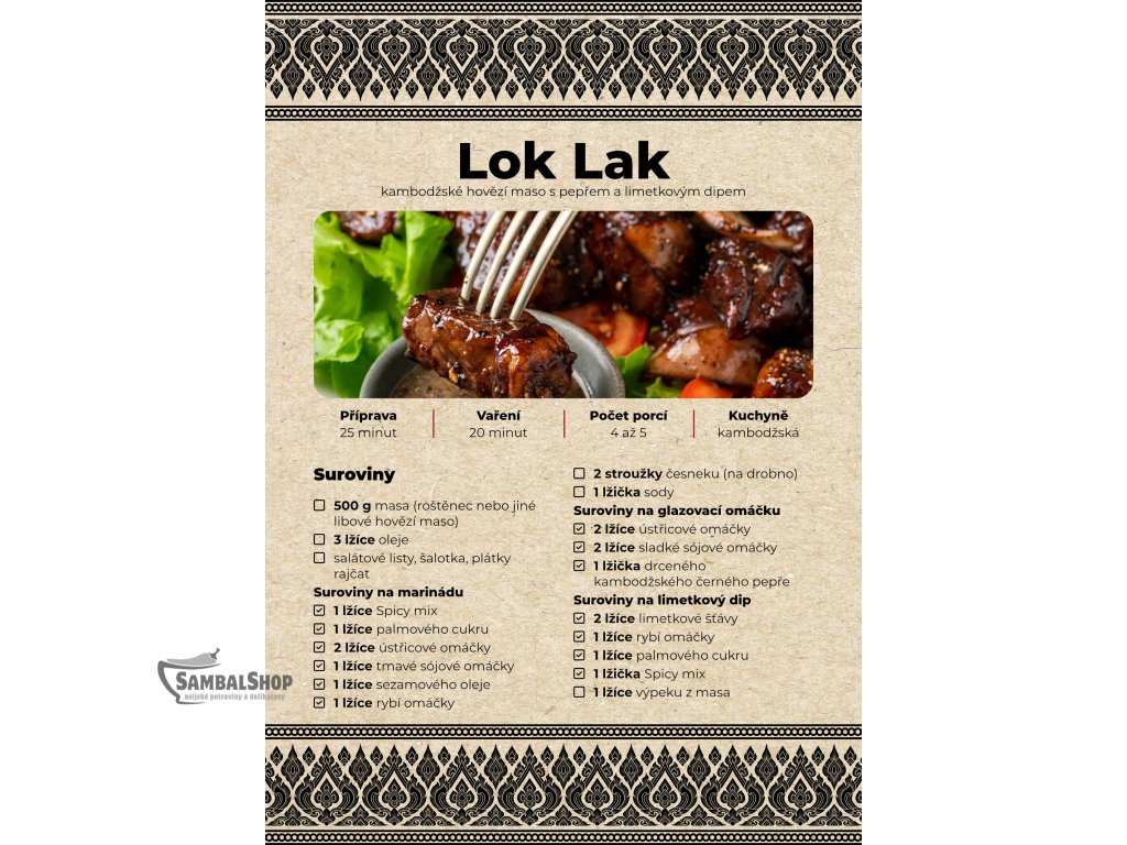 Originální sada na přípravu kambodžského hovězího grilovaného masa Lok Lak, která obsahuje všechny potřebné základní suroviny a doplňky. Součástí sady je také jednoduchý a...