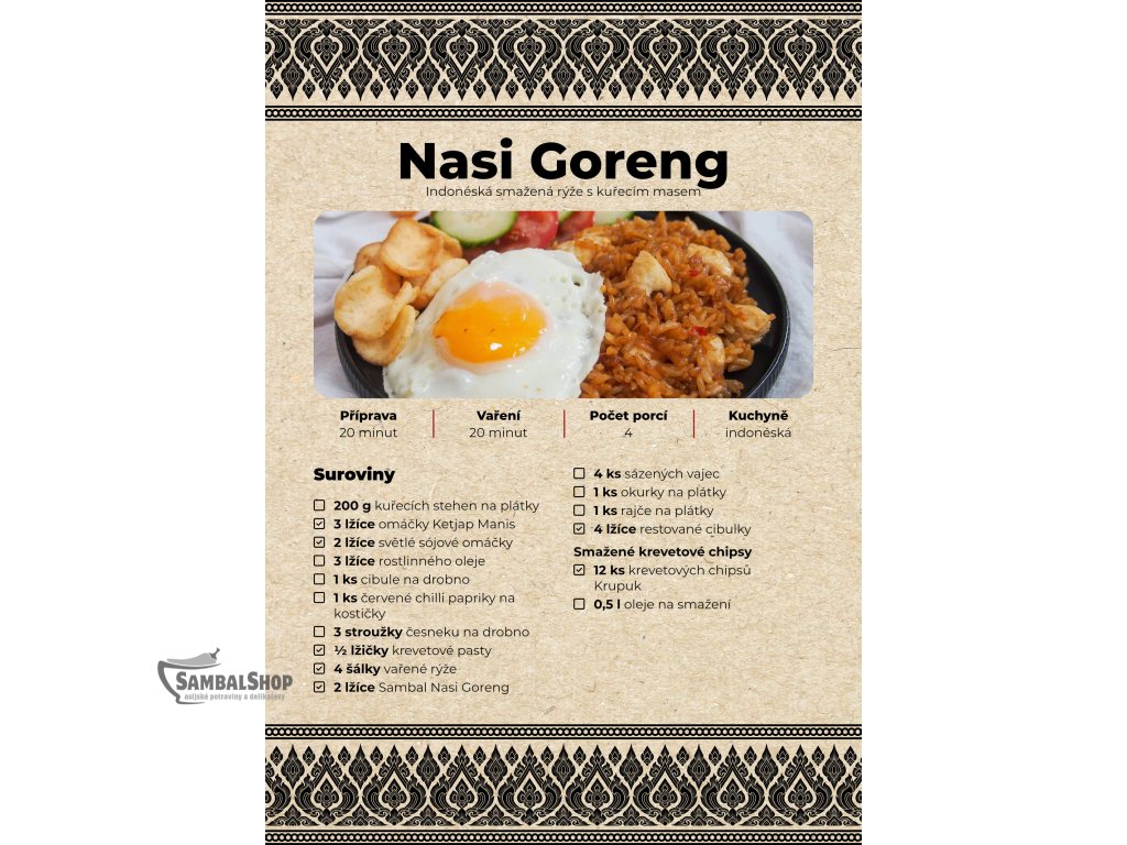 Představujeme vám profesionálně zpracovaný tištěný recept na přípravu autentického indonéského pokrmu Nasi Goreng. Tato tradiční smažená rýže je považována za národní pokrm Indonésie a vyniká svojí bohatou kombinací chutí díky speciální kořeněné pastě, čerstvé zelenině a tradičnímu podávání s křupavými krupičkami a smaženým vejcem.