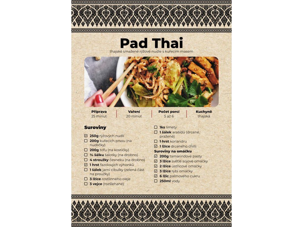 Představujeme vám profesionálně zpracovaný tištěný recept na přípravu legendárního thajského pokrmu Pad Thai. Tato národní thajská specialita kombinuje jemné rýžové nudle s křupavou zeleninou, aromatickými kořeními a charakteristickou sladkokyselou omáčkou, vytváří tak dokonalou harmonii chutí typickou pro autentickou thajskou gastronomii.