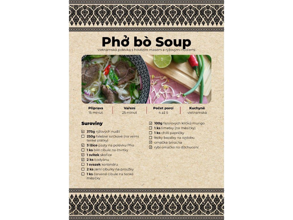 Představujeme vám profesionálně zpracovaný tištěný recept na přípravu autentické vietnamské polévky Pho Bo. Tento národní pokrm Vietnamu kombinuje aromatický hovězí vývar s jemnými rýžovými nudlemi, křehkým hovězím masem a čerstvými bylinkami, vytváří tak nezapomenutelný chuťový zážitek, který představuje srdce vietnamské gastronomie.