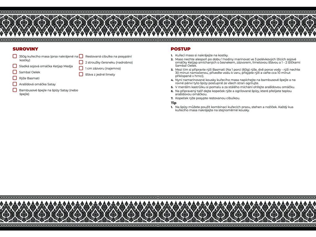 Představujeme vám profesionálně zpracovaný tištěný recept na přípravu tradičního pokrmu Satay. Tyto aromatické grillované špízy pocházející z jihovýchodní Asie kombinují jemně marinované maso s exotickými kořeními a podávají se s bohatou arašídovou omáčkou, vytváří tak dokonalou harmonii chutí typickou pro malajskou a indonéskou kuchyni.