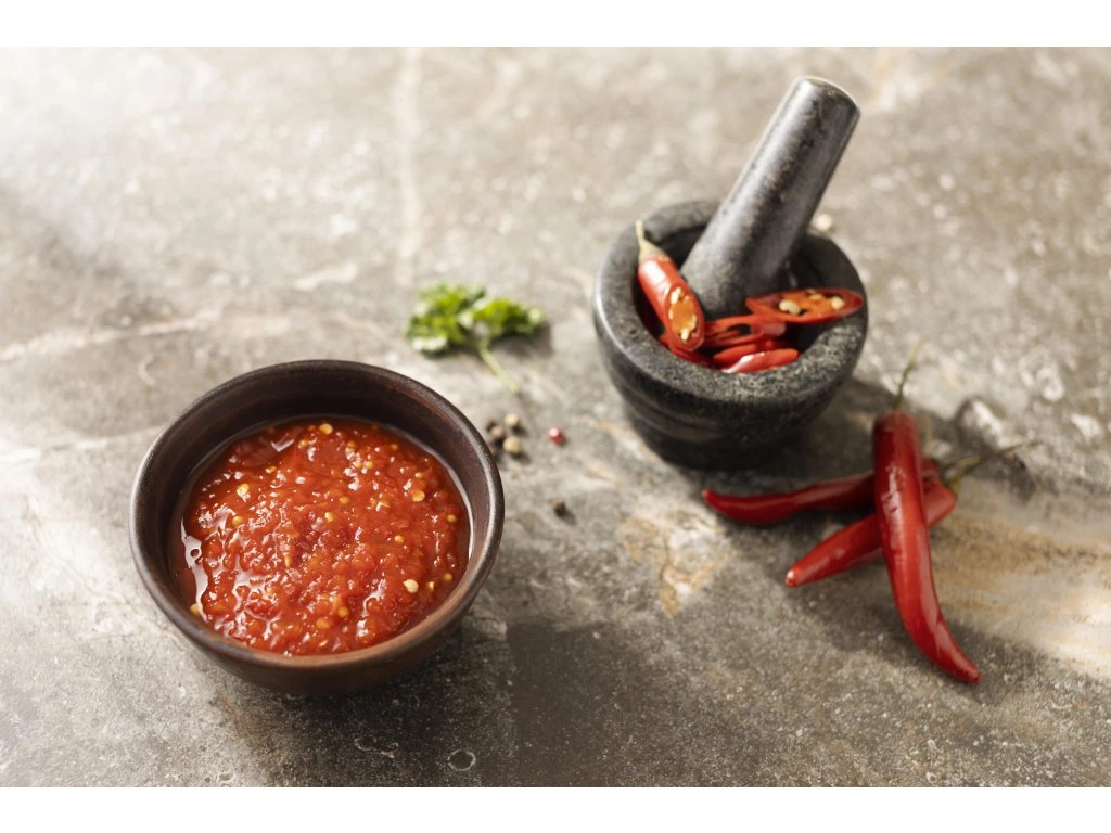 Složeníčerstvě mleté pikantní papričky 38%, mleté cibulky, rostlinný olej, sůl, cukrový sirup, jemný třtinový cukr, šalotková pasta, <2% hovězí vývar, L-glutaman sodný, česneková pasta, kyselina citronová, kyselina L-askorbová, guma guar, xanthan, sorban draselný, benzoan sodný, kyselina octová, disiřičitan draselný |